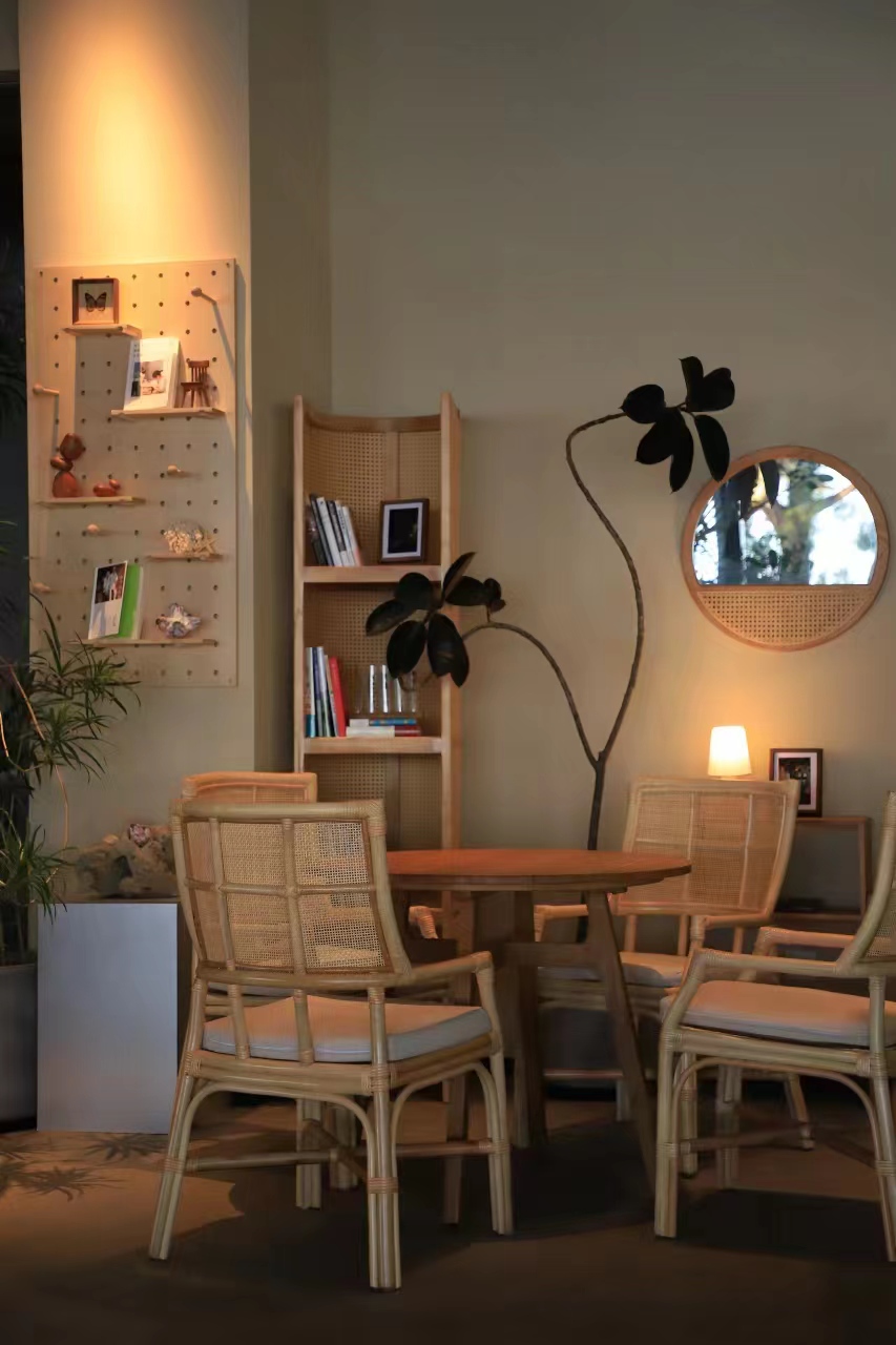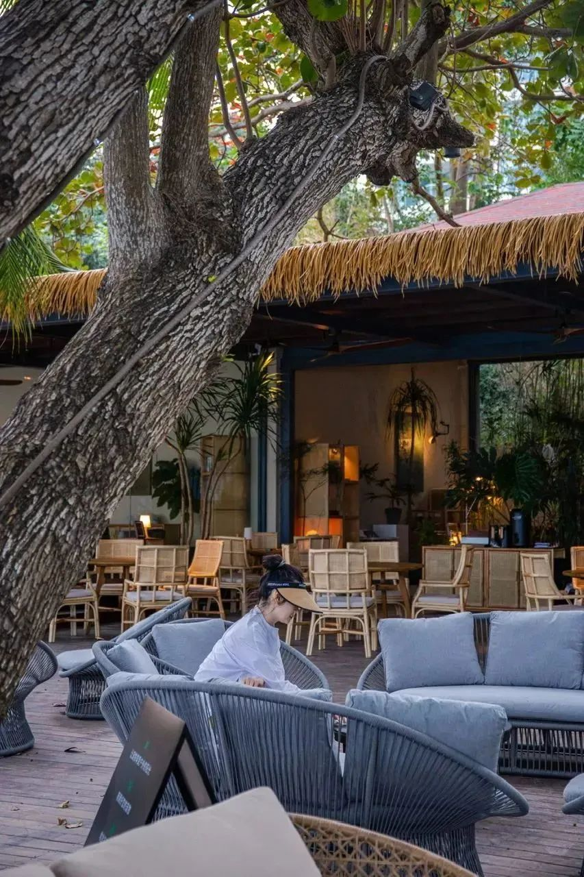 自然編織的茅草小屋、原木藤編桌椅,使用餐區(qū)域有一絲南洋風(fēng)情的復(fù)古,也帶來一絲松弛感,喝一杯咖啡,讀一本好書,也可以隨時打個小盹。